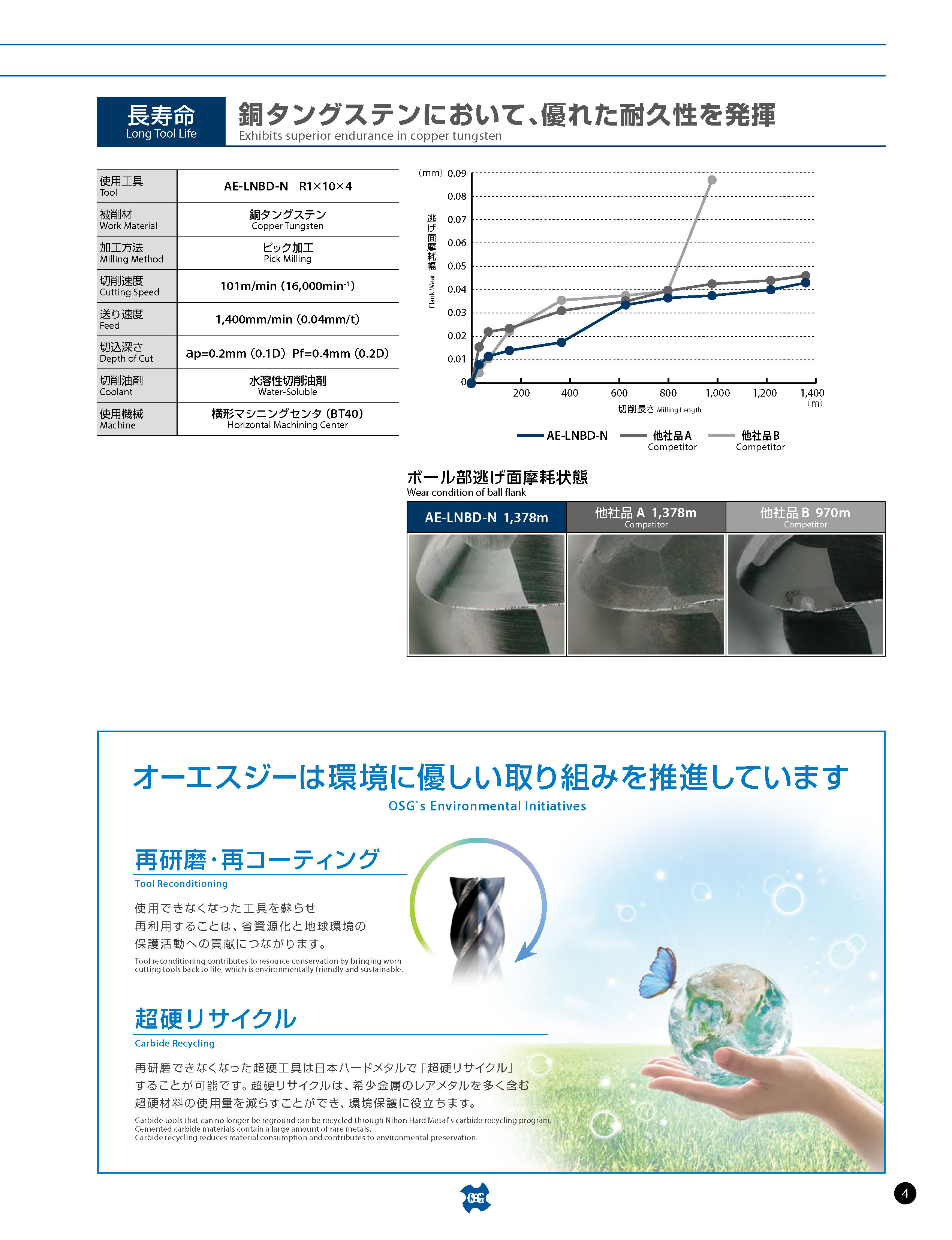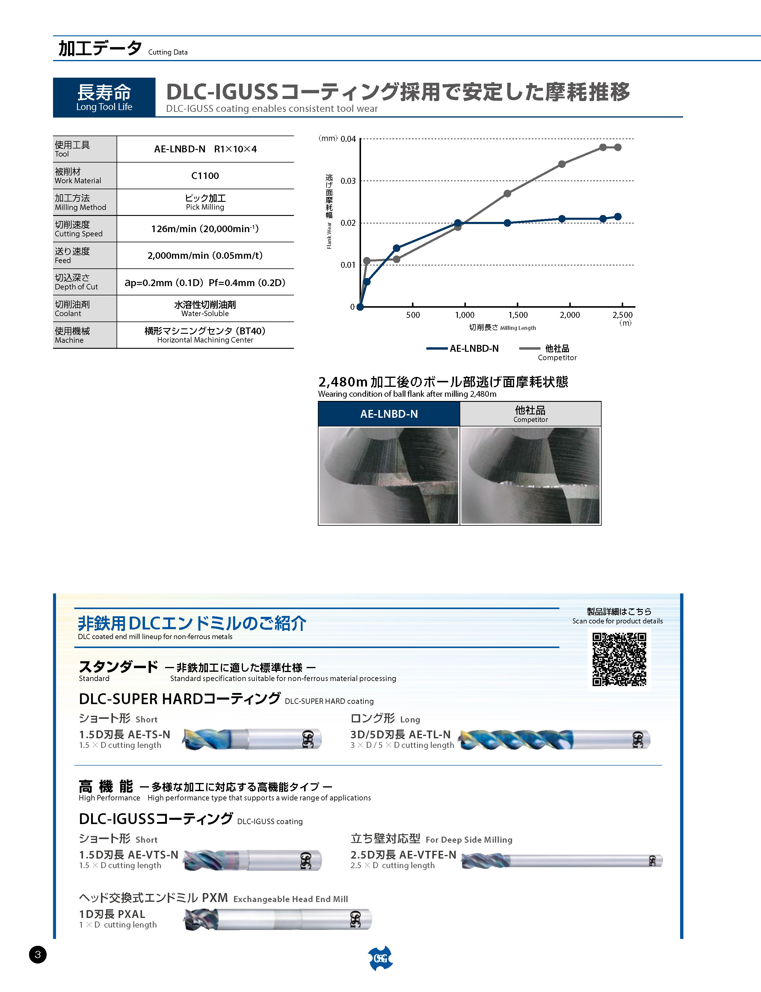 高品位な加工を実現するボール部とティアドロップ形状の外周部にて構成されたDLCコーティングエンドミル。バリの無い良好な加工面を実現出来ます。