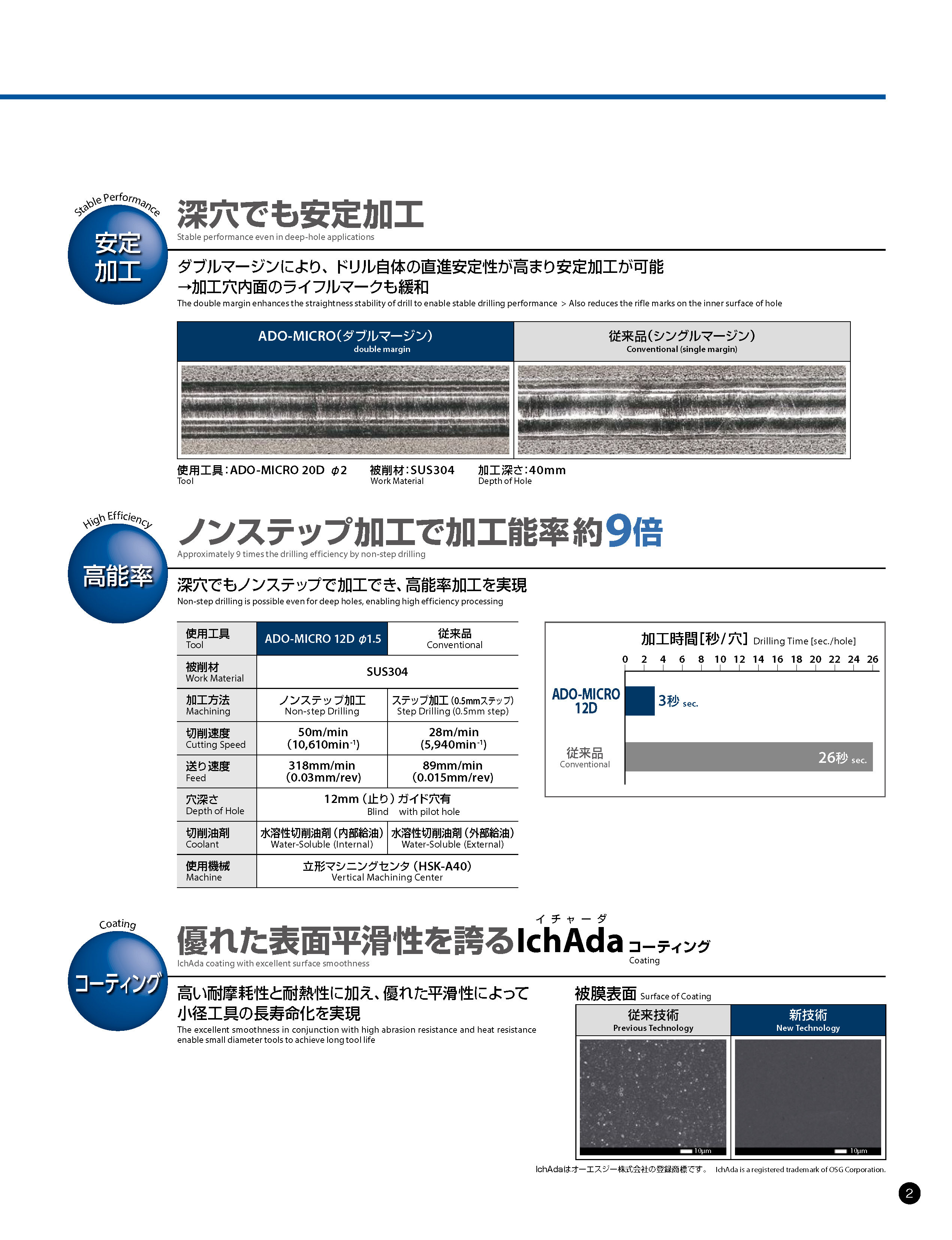 抜群の切りくず排出性にこだわり、小径深穴加工でも安定かつ高能率加工可能なドリルです。中空穴付きシャンクでクーラント排出量が多く、特殊溝構造にて難しい小径深穴でも安定加工を実現。