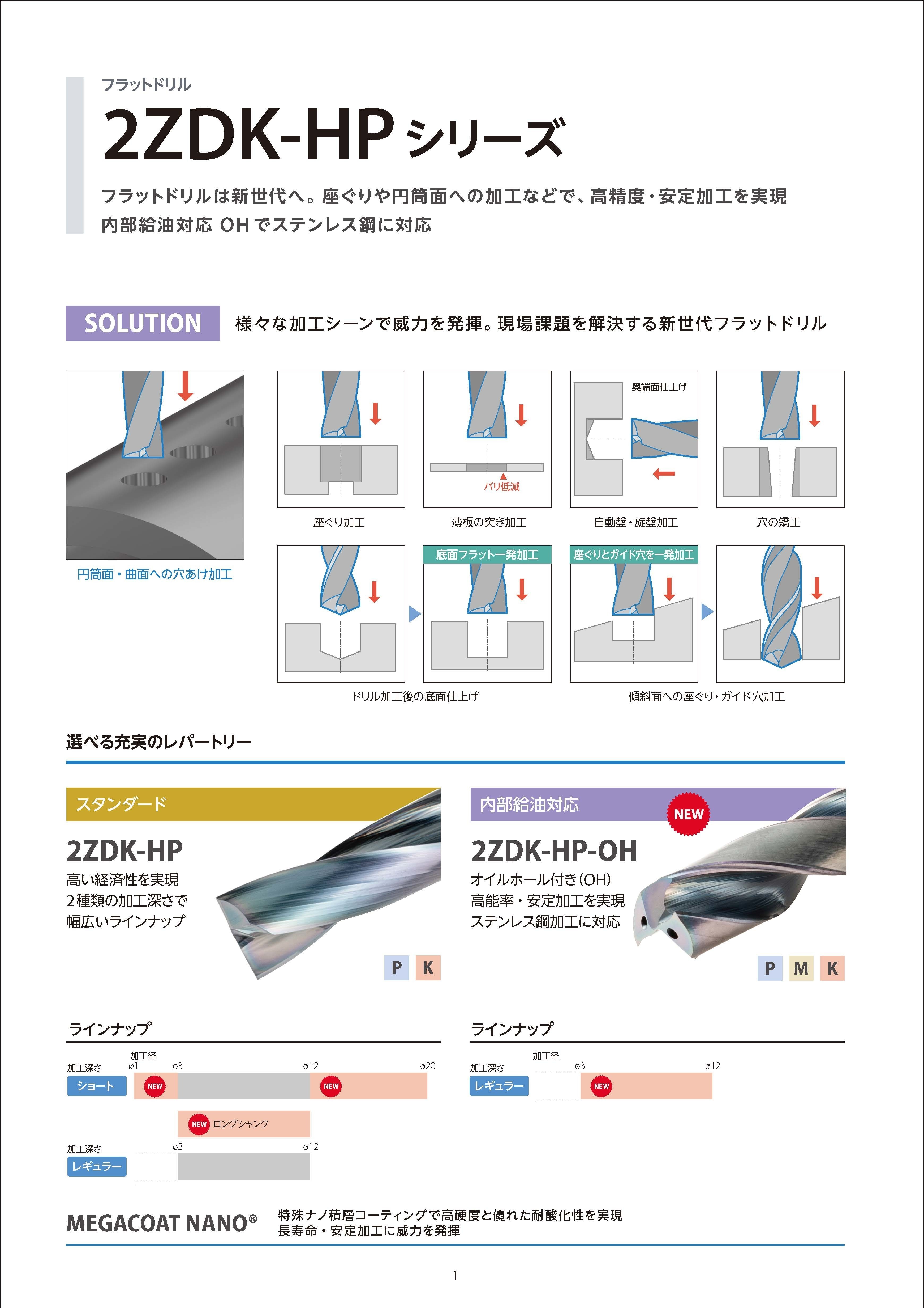座ぐりや円筒面への加工など、多様な用途で安定加工を実現 特殊シンニング形状で工具の振れを抑制し、低抵抗なコーナ仕様でバリを低減 特殊ナノ積層コーティング MEGACOAT NANO で長寿命 加工径レパートリー大幅拡充、ロングシャンクタイプ発売 内部給油対応が新登場。ステンレス鋼加工に対応
