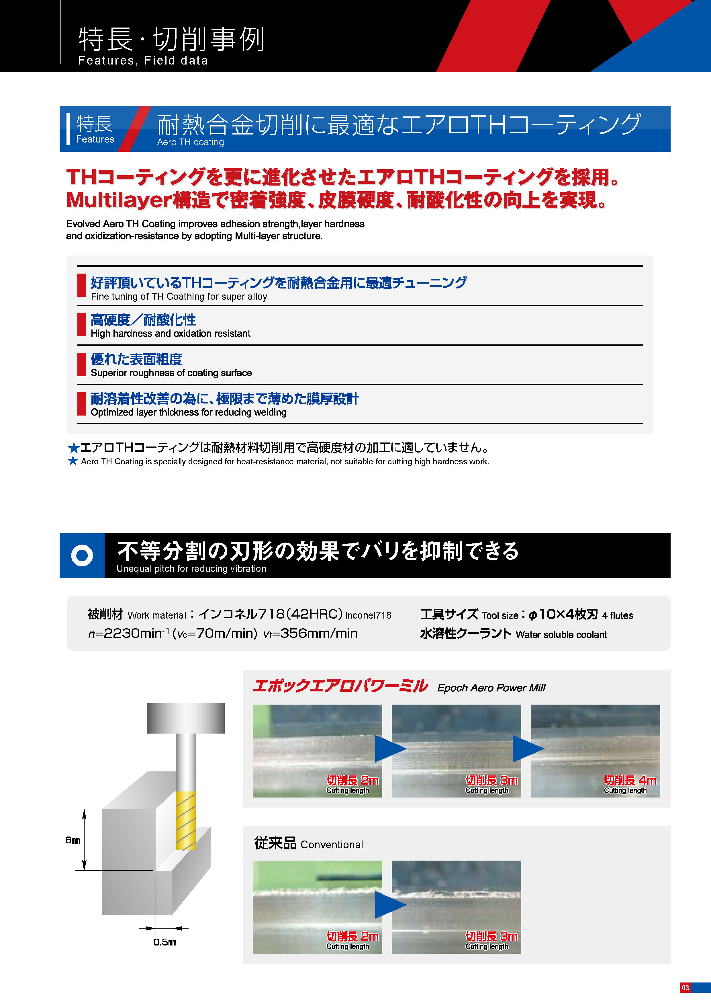 カタログのP5の下部に掲載 新開発のエアロTHコートを採用 超耐熱合金、チタン合金などの難削材の切削に最適な超硬エンドミル
