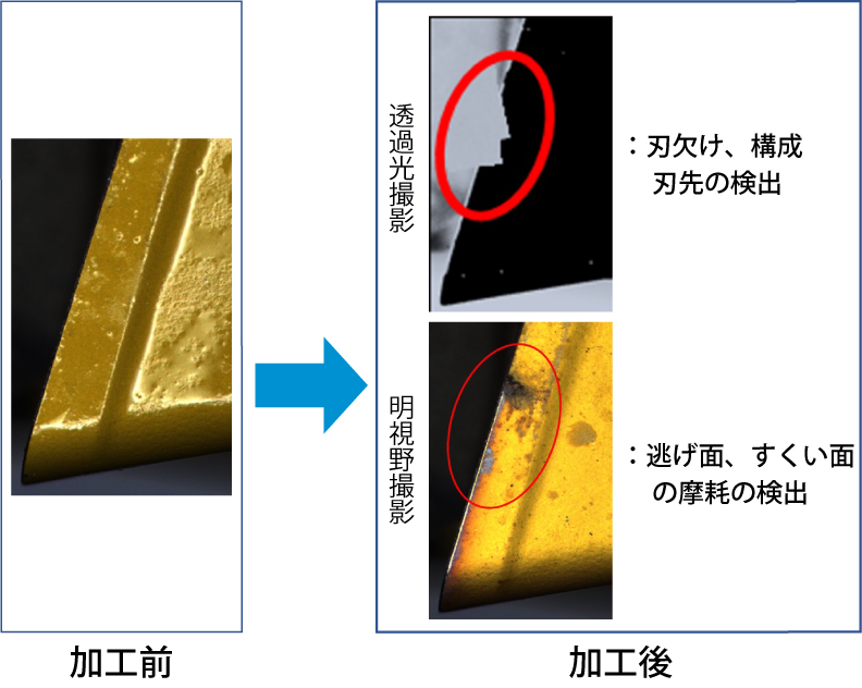 透過光撮影では工具の外観摩耗状況の判定はできるものの、